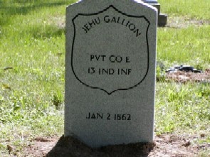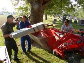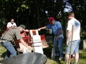 Larry Myer, Jon Ayers, & David Kirchner at Lindley Cemetery wrestling one of five Civil War Veteran stones. Picture by Russ Kirchner.
